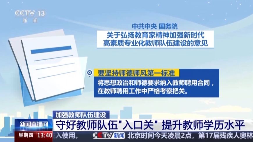 近日,《中共中央国务院关于弘扬教育家精神加强新时代高素质专业化教师队伍建设的意见》发布。意见就严把教师“入口关”、提升中小学教师队伍学历水平、保障教师惩戒权等方面作出明确要求。