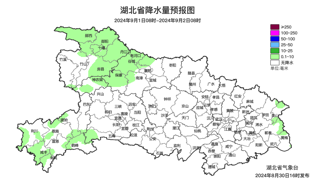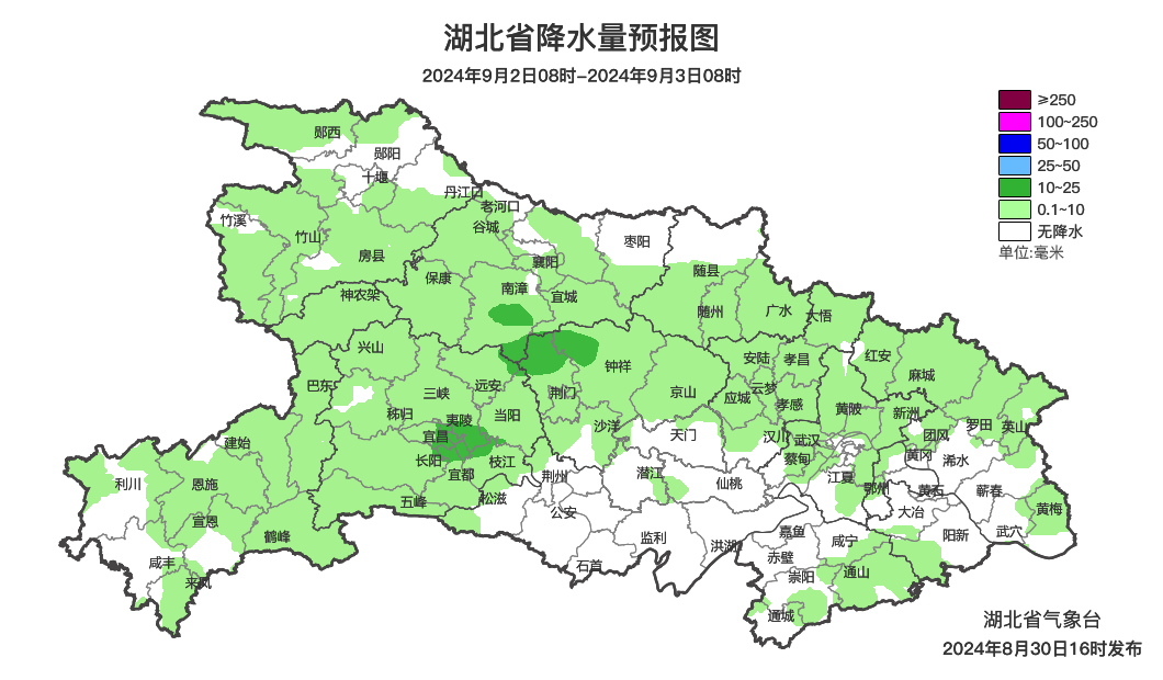 9月2日08时-9月3日08时,湖北省多云有分散性阵雨或雷阵雨,其中鄂西北东部、鄂西南东部、江汉平原北部局地中到大雨并伴有雷暴大风、短时强降水等强对流天气。最高气温鄂西北31~35℃、其他地区36~39℃,最低气温24~29℃,偏北风3到4级、阵风5到6级。