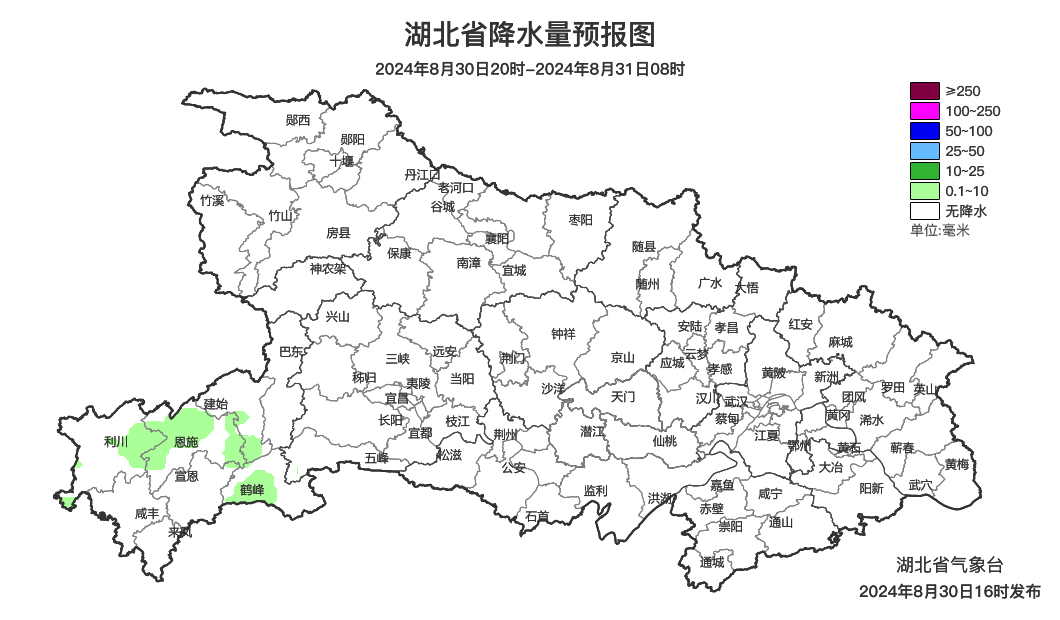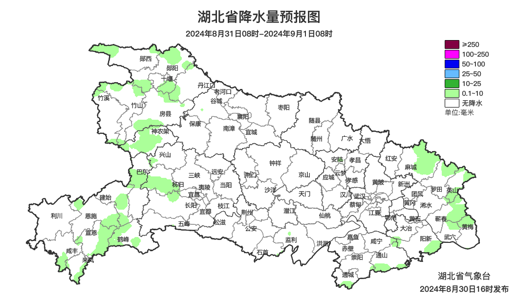 30日20时-31日08时,湖北省多云到晴天,其中鄂西南局地有阵雨或雷阵雨。最低气温24~28℃,偏东风2到3级。