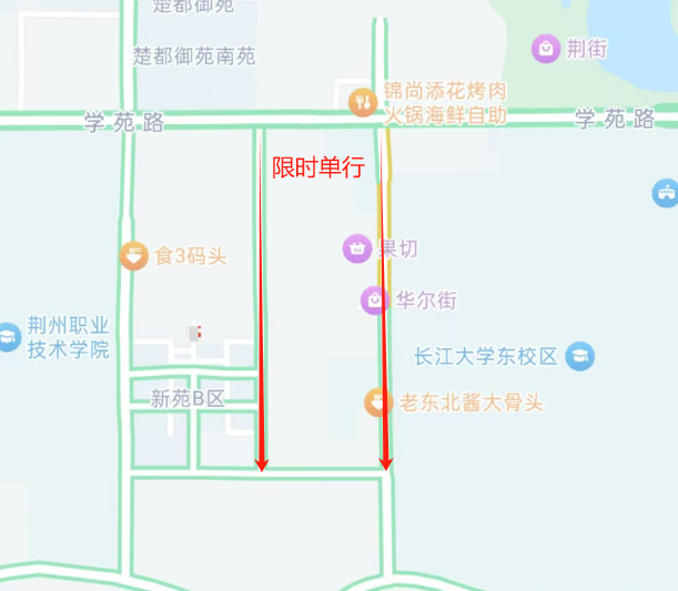 为缓解学校夜市周边道路交通压力,保障夜市烟火气息,维护好道路交通秩序,荆州交警对新风一路、新风二路实施限时单向通行管理措施。