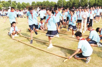 9月2日,荆州纪南文旅区实验学校开展竹竿舞、跳长绳等特色课外活动,迎接新学期。(通讯员:何艺伟 摄)