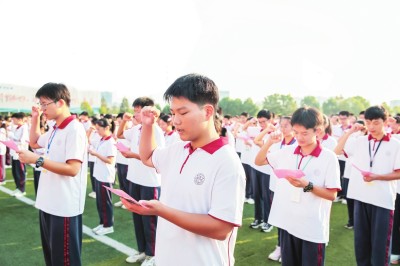 9月1日,沙市中学开学典礼上,学生集体宣誓。(记者:解慧 通讯员:高伦强 摄)