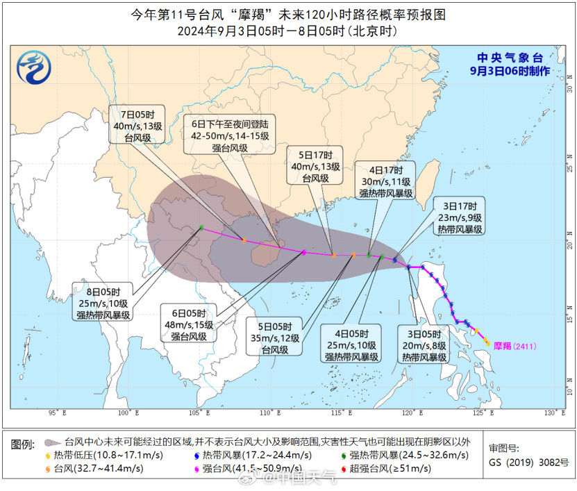 ③台风“摩羯”或将于6日下午到夜间在海南岛东部到广东西部一带沿海登陆,登陆时中心附近最大风力有14-15级(42-50米/秒,强台风级)。