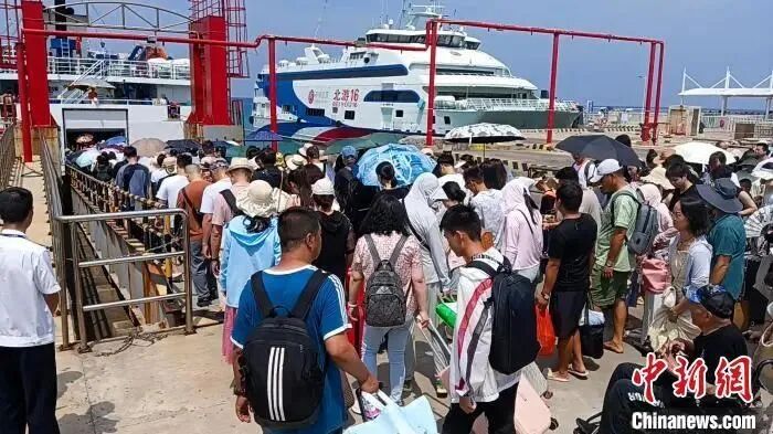 9月4日,旅客在涠洲岛有序乘船返回北海。