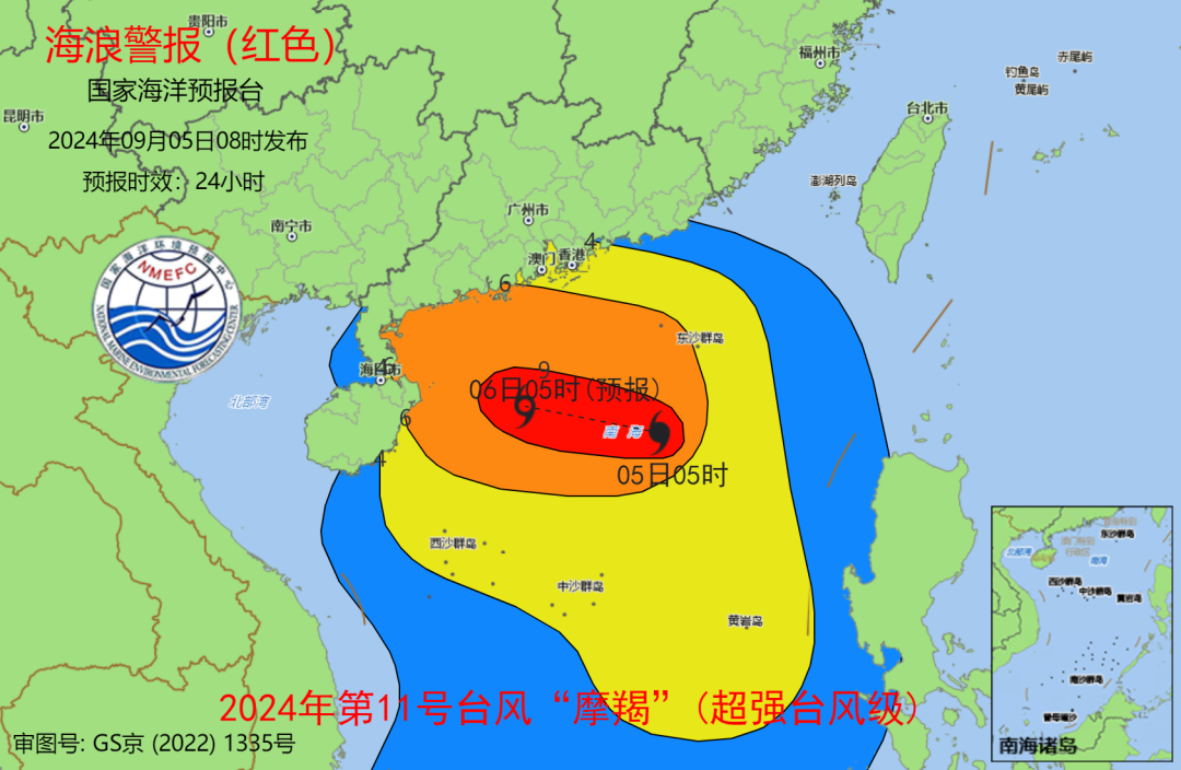 国家海洋预报台海浪红色警报:9月5日中午到6日中午,南海北部将出现8到13米的狂浪到狂涛区,近海海域海浪预警级别为橙色;广东西部、海南东部近岸海域将出现4到6米的巨浪到狂浪,该近岸海域海浪预警级别为红色,广东东部近岸海域将出现2.5到4米的大浪到巨浪,该近岸海域海浪预警级别为黄色。