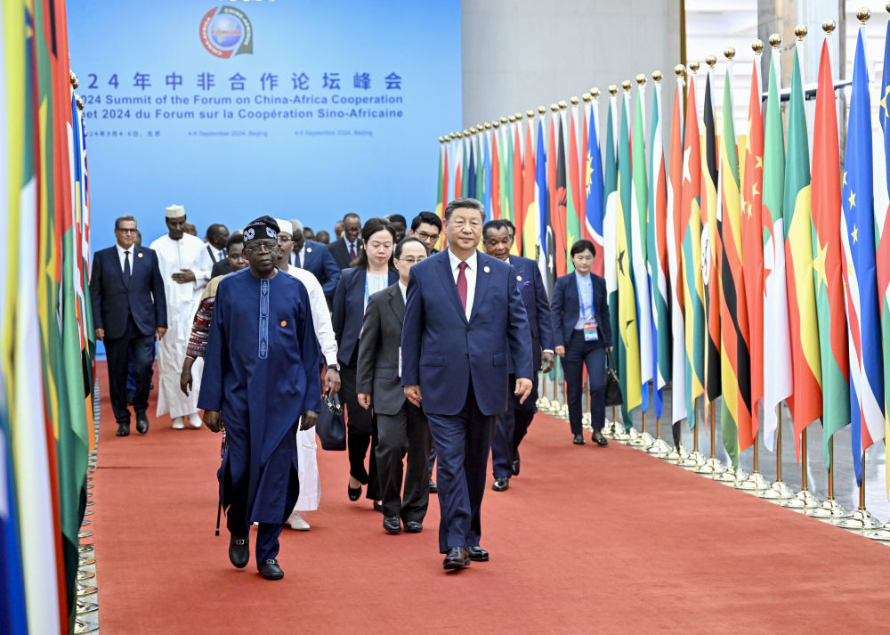 习近平指出,在这收获的季节,很高兴同各位新老朋友相聚北京,共商新时代中非友好合作大计。中非友好穿越时空、跨越山海、薪火相传。中非合作论坛成立24年来特别是新时代以来,中国同非洲兄弟姐妹们本着真实亲诚理念,在世界百年变局中肩并肩、手拉手,坚定捍卫彼此正当权益;在经济全球化大潮中强筋骨、壮体魄,累累硕果惠及中非亿万百姓;在大灾大疫面前同甘苦、共拼搏,书写了一个个中非友好的感人故事;始终相互理解、彼此支持,树立了新型国际关系的典范。经过近70年辛勤耕耘,中非关系正处于历史最好时期。面向未来,中方提议将中国同所有非洲建交国的双边关系提升到战略关系层面,将中非关系整体定位提升至新时代全天候中非命运共同体。