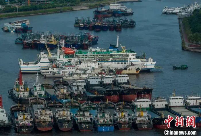 为防范台风“摩羯”,海南各类船只纷纷回港避风。(无人机照片)中新社记者 骆云飞 摄