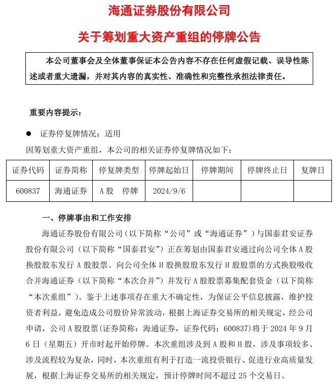 鉴于上述事项存在重大不确定性,为保证公平信息披露,维护投资者利益,避免造成股价异常波动,根据上海证券交易所的相关规定,经申请,国泰君安、海通证券A股股票将于2024年9月6日(星期五)开市时起开始停牌。