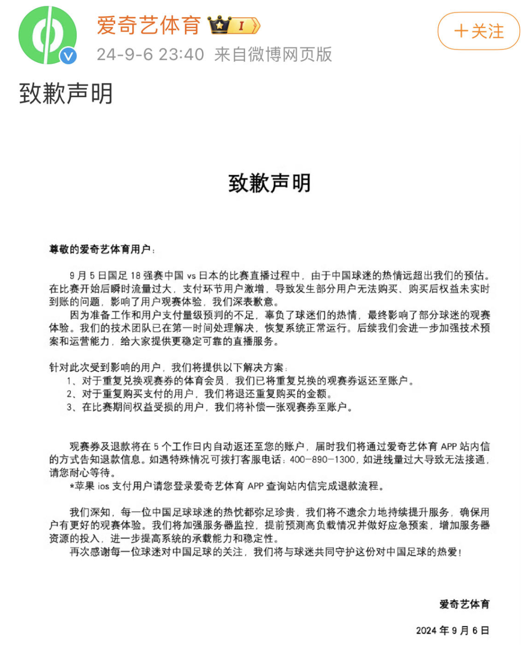 9月6日晚间,爱奇艺体育发布致歉声明称,9月5日国足18强赛中国vs日本的比赛直播过程中,由于中国球迷的热情远超出我们的预估。在比赛开始后瞬时流量过大,支付环节用户激增,导致发生部分用户无法购买、购买后权益未实时到账的问题,影响了用户观赛体验,我们深表歉意。