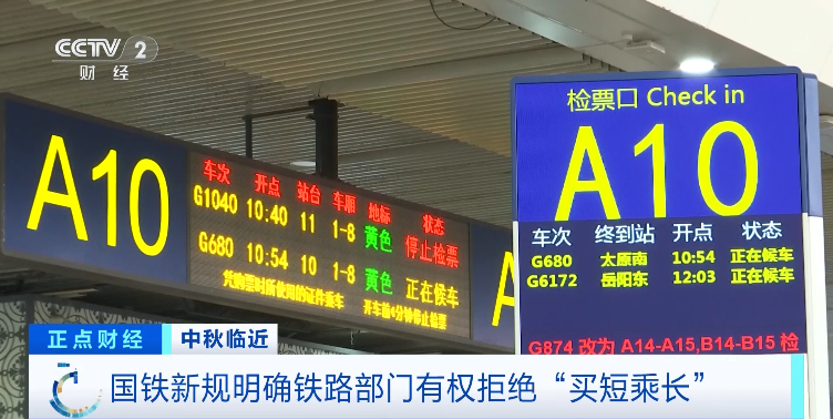 广东台记者 郑泽燕:近几年的“五一” “国庆”假期,由于大量旅客“买短乘长”,导致车辆超载,后续正常购票的旅客没有办法上车,甚至导致列车没有办法正常运行的情况,也是屡屡发生。国铁新规明确铁路部门有权拒绝“买短乘长”