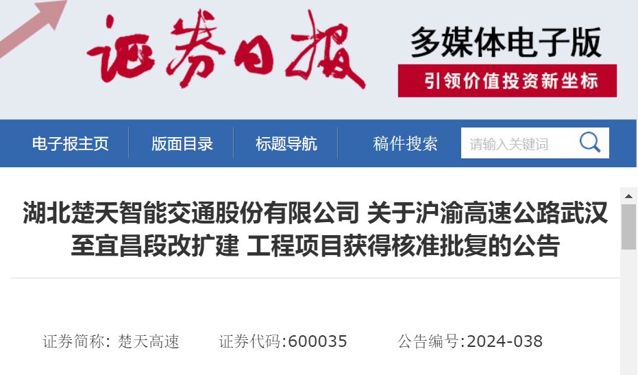 近日,湖北楚天智能交通股份有限公司发布《关于沪渝高速公路武汉至宜昌段改扩建工程项目获得核准批复的公告》(简称《公告》)。