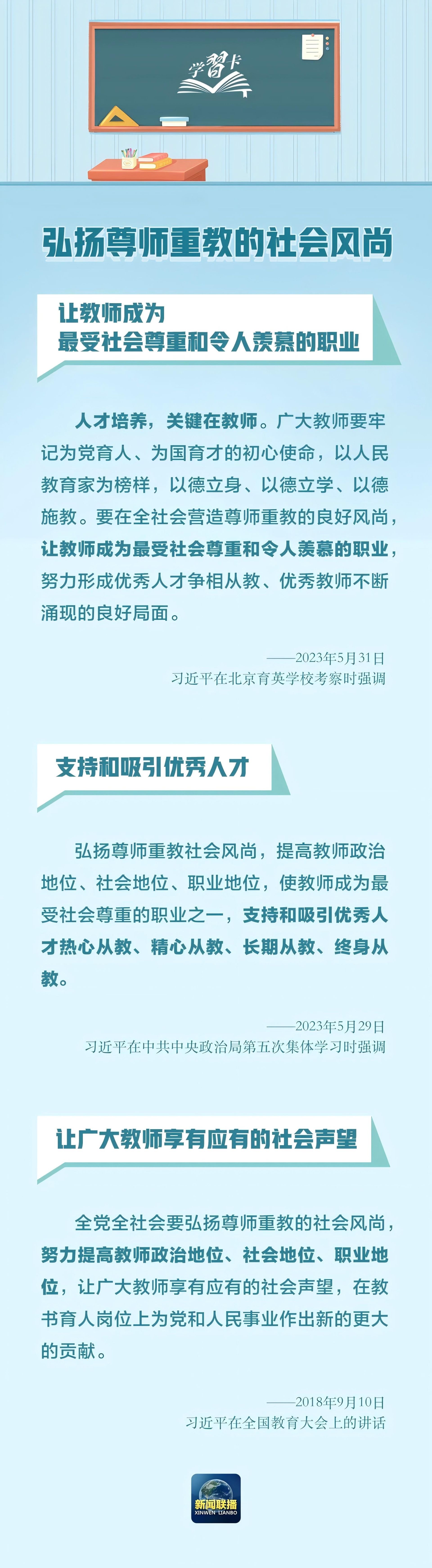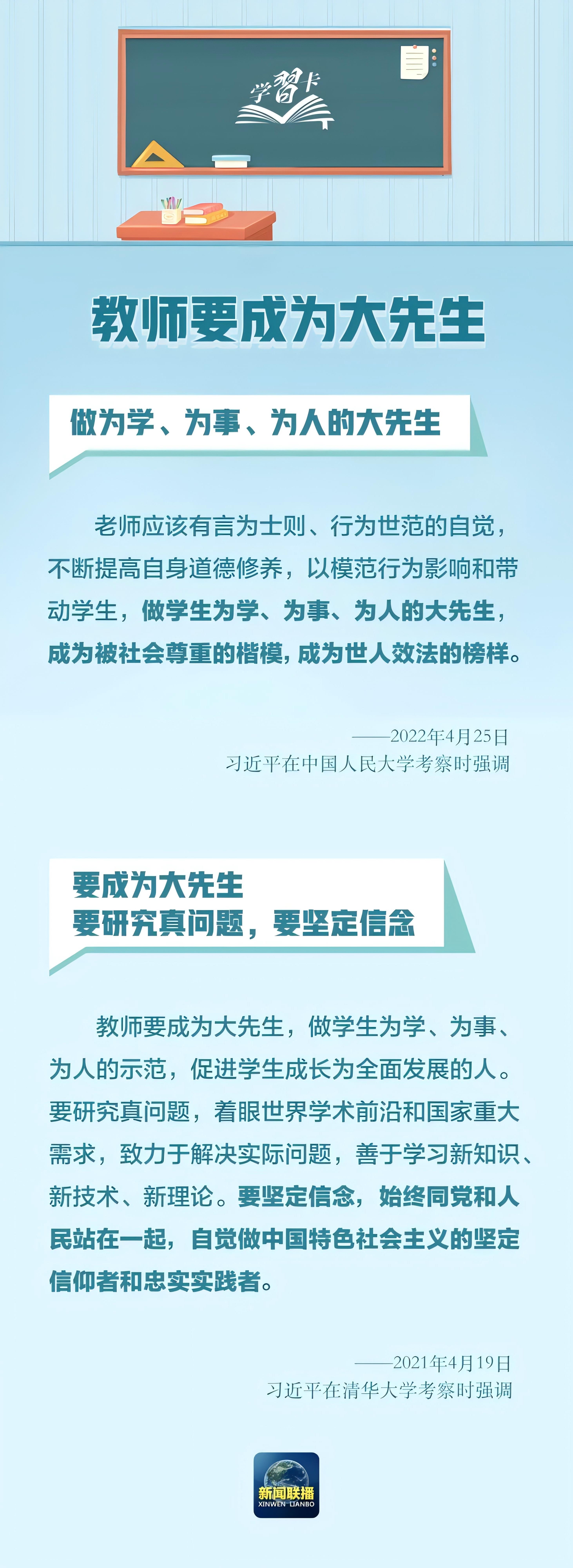 学习卡丨教师要成为大先生 2024-09-09 15:03 0 百年大计,教育为本。教育大计,教师为本。 党的十八大以来,以习近平同志为核心的党中央高度重视教师队伍建设问题,在不同场合多次强调教师工作的重要意义。 在我国第四十个教师节到来之际,让我们重温总书记的话语,一起学习 ↓↓↓
