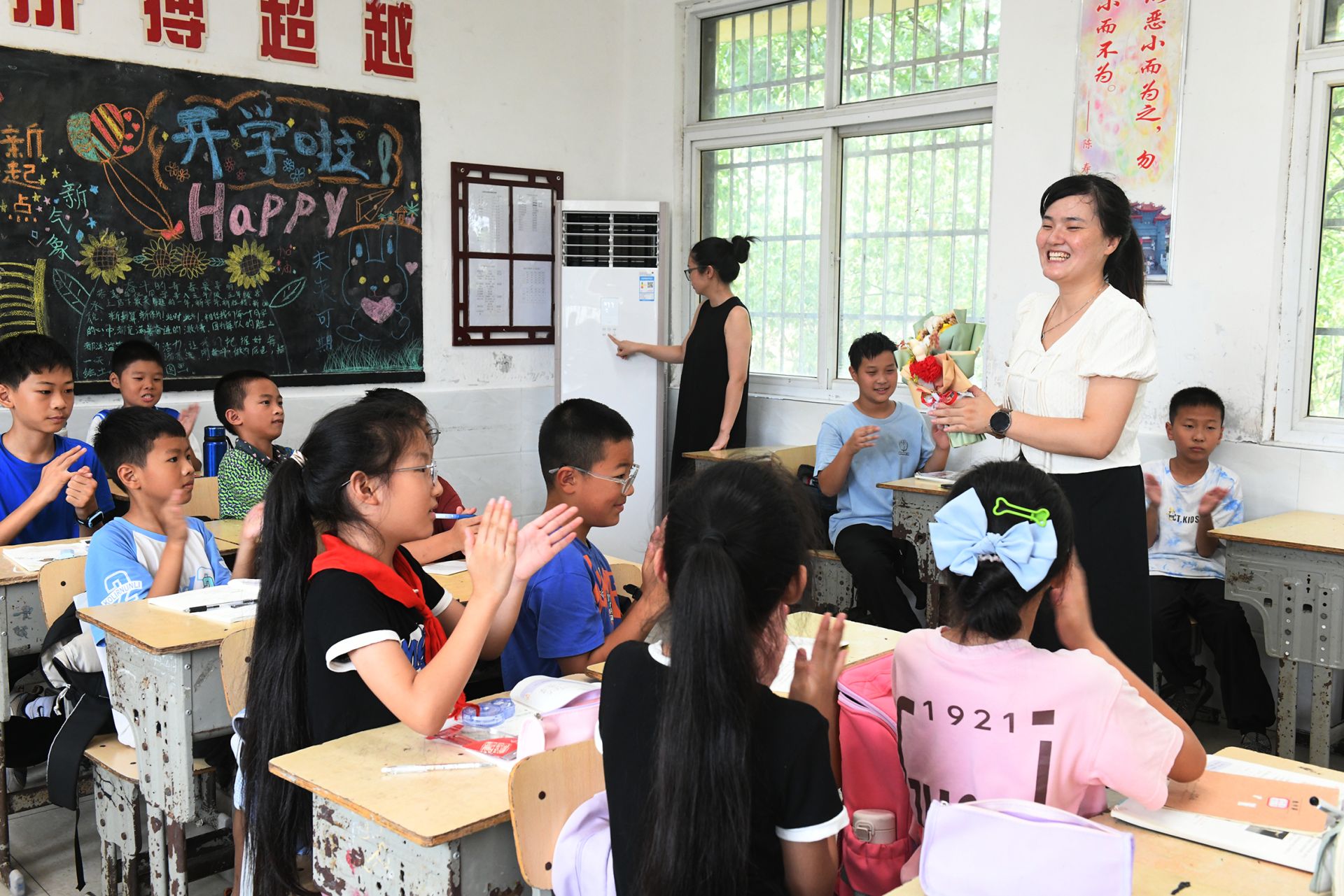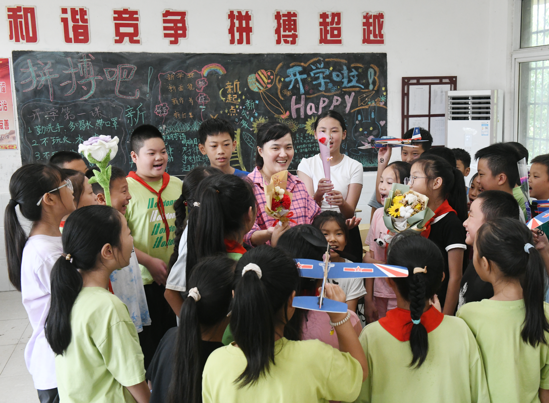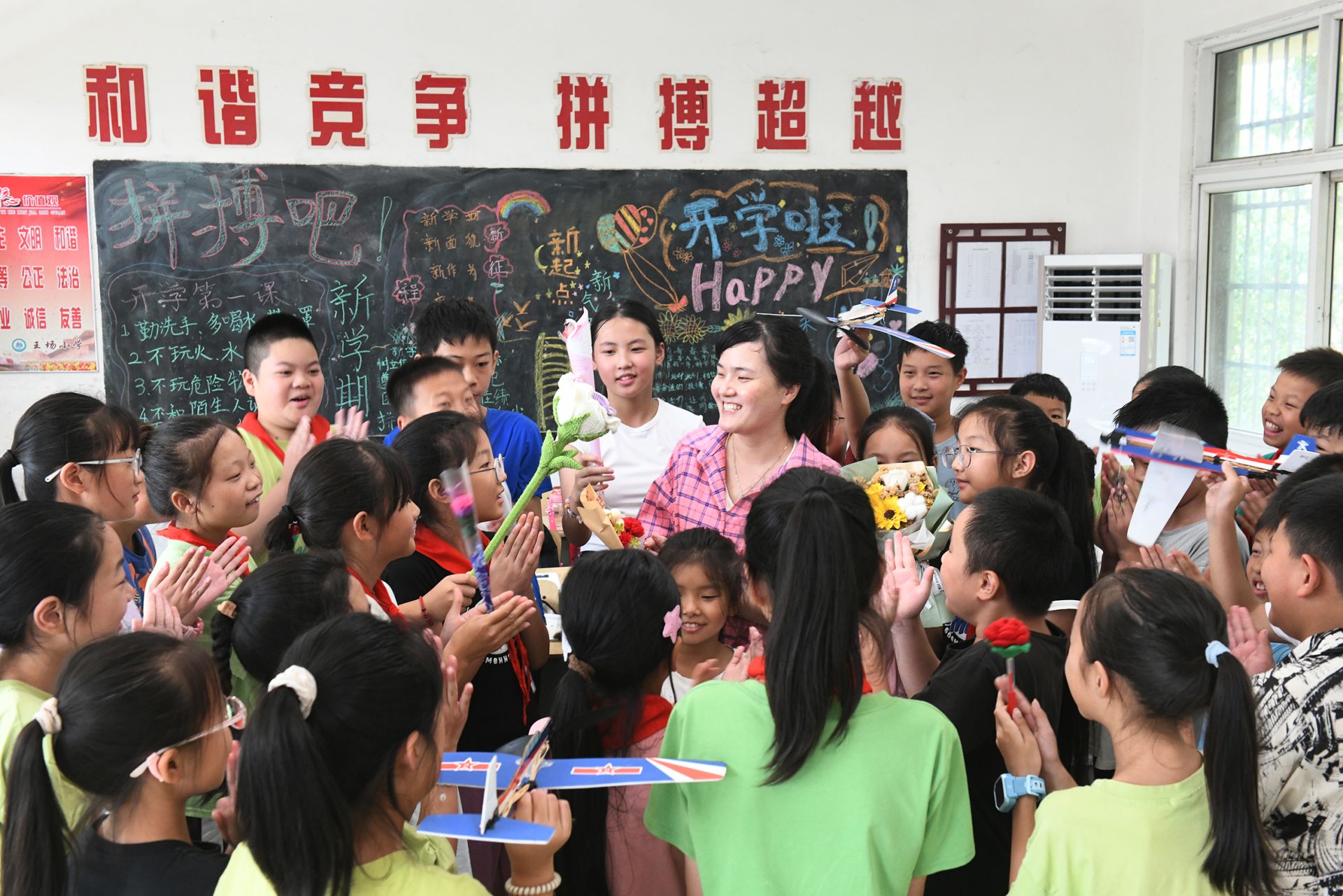 江汉风报道:在第40个教师节来临之际,9月10日,在荆州区八岭山镇三桥村王场小学,同学们把班主任郭老师紧紧蔟拥在中间,又是送鲜花又是送祝福,并齐声高喊老师你辛苦啦,祝你节日快乐!
