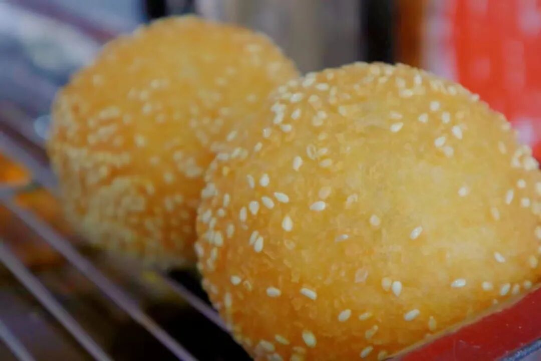 由糯米粉滚成圆团,再裹上芝麻炸熟而成
