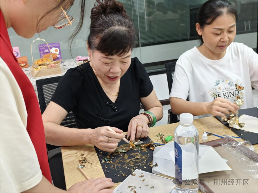 在志愿者的指导下,居民们手执画笔与金箔,通过画、涂、贴、扫,勾勒出一幅幅精美的箔画。