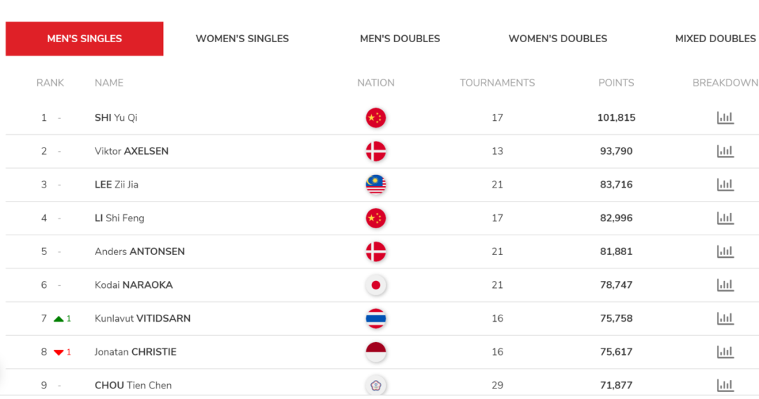 石宇奇、安洗莹、梁伟铿/王昶、陈清晨/贾一凡、郑思维/黄雅琼继续位列各单项第一。蒋振邦/魏雅欣排名升至第二,创职业生涯新高。
