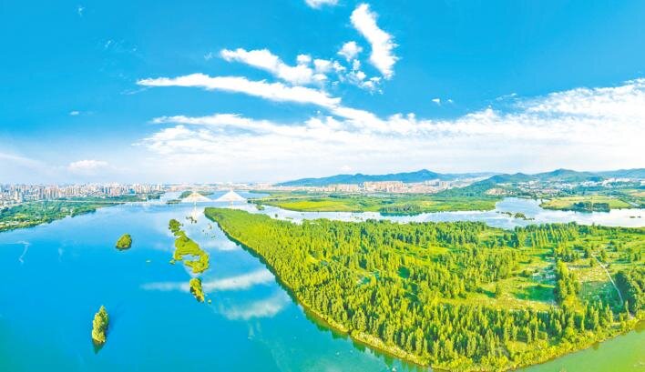6月14日,襄阳市汉江国家湿地公园绿意盎然,城园相融、蓝绿交织,绘就一幅美丽生态画卷。 (杨东 摄)