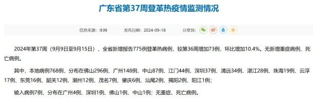 广东疾控的数据显示,2024年第37周(9月9日至9月15日),全省新增报告775例登革热病例,较第36周增加73例,环比增加10.4%。无新增重症病例、死亡病例。