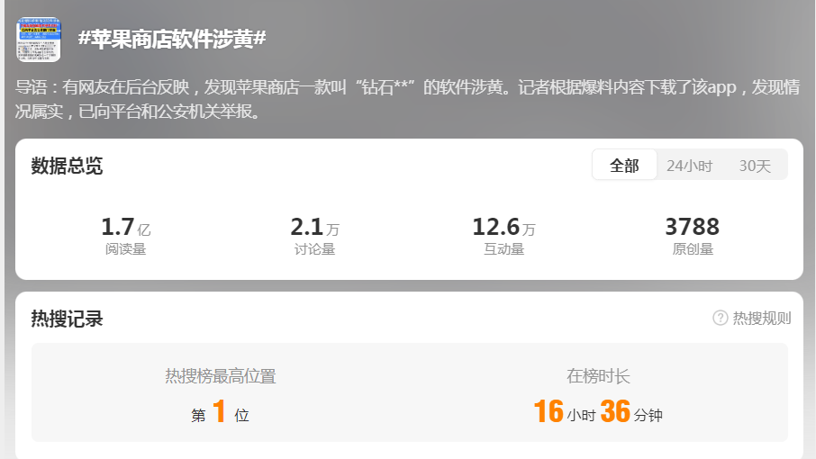 9月25日,有网友发现苹果应用商店一款叫“钻石**”的软件涉黄。随后#苹果商店软件涉黄#话题冲上热搜,引发网友热议。