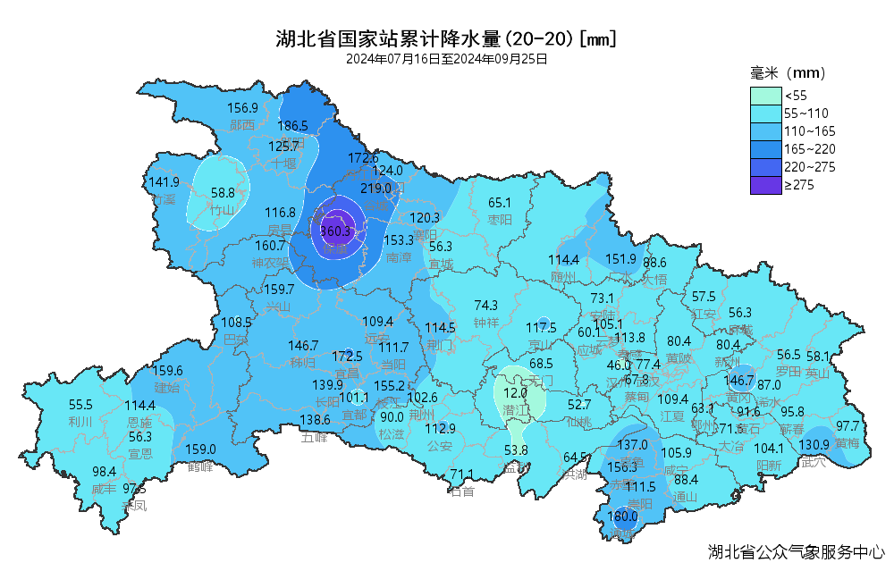 二、晴热高温时间长。湖北全省平均气温、平均最高和最低气温分别较常年同期偏高2.8℃、3.3℃和2.4℃,35℃以上高温日数长达38天,较常年偏多23天,排历史第1,57个国家气象站日最高气温打破或追平当地9月历史纪录。