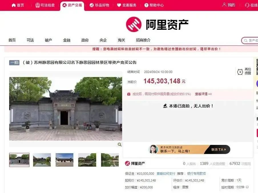 9月24日一场标的为国家4A级旅游景区江苏苏州静思园的破产拍卖因无人参加以流拍告终该园始建于1993年沿袭了苏州古典园林风格评估总价为1.45亿余元
