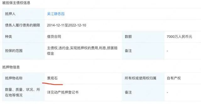 景观石抵押给银行7000万元。企查查APP截图