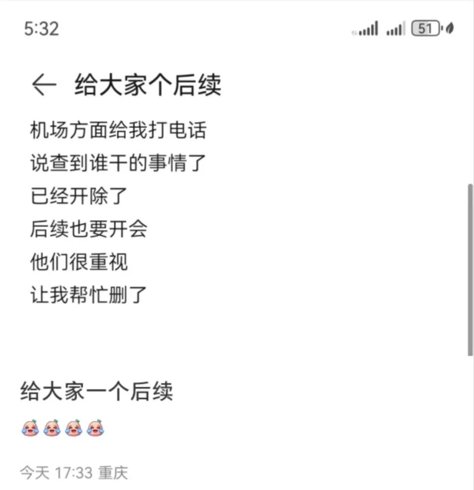 仅半小时后,自称安检队队长的上海虹桥机场工作人员用私人手机号码联系张赞,称会将涉事人员作开除处理。