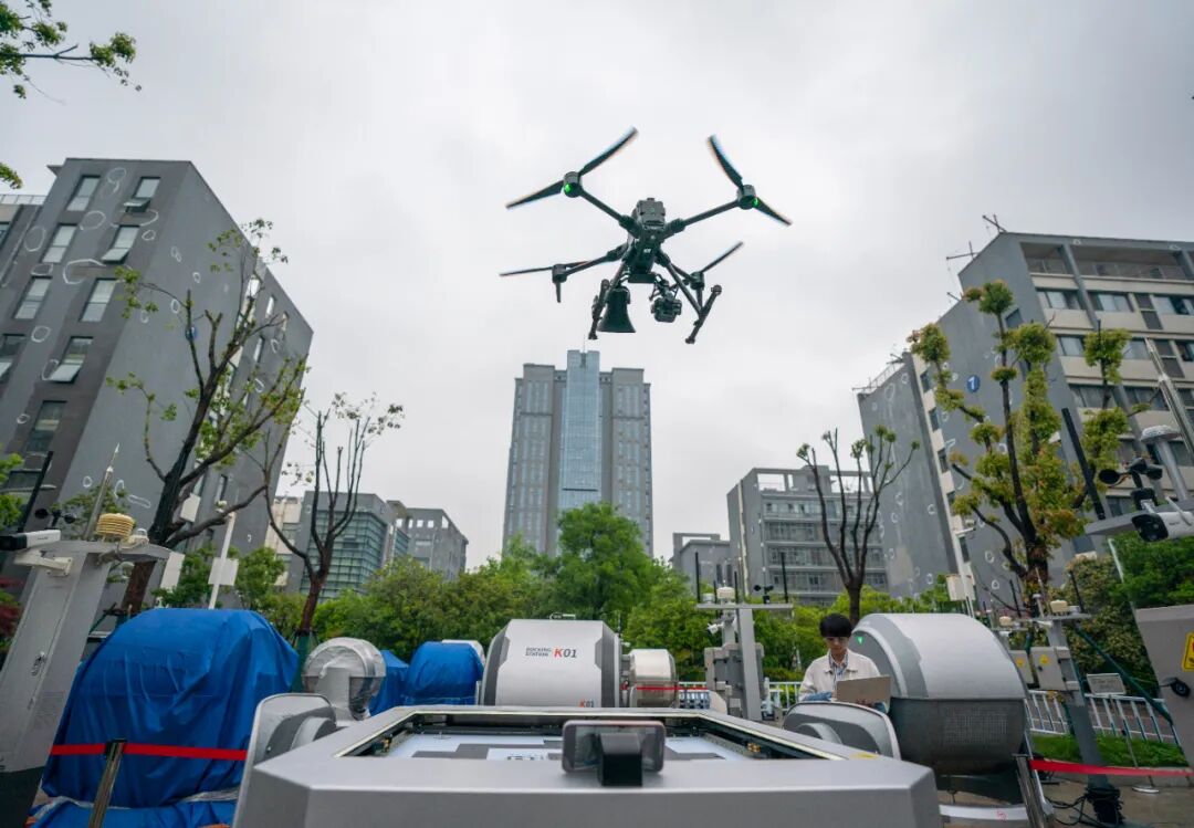 2023年4月13日,位于光谷的普宙科技测试场,几架挂载不同设备的无人机从科幻造型的智能机库自动飞出进行作业。