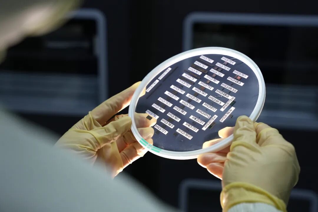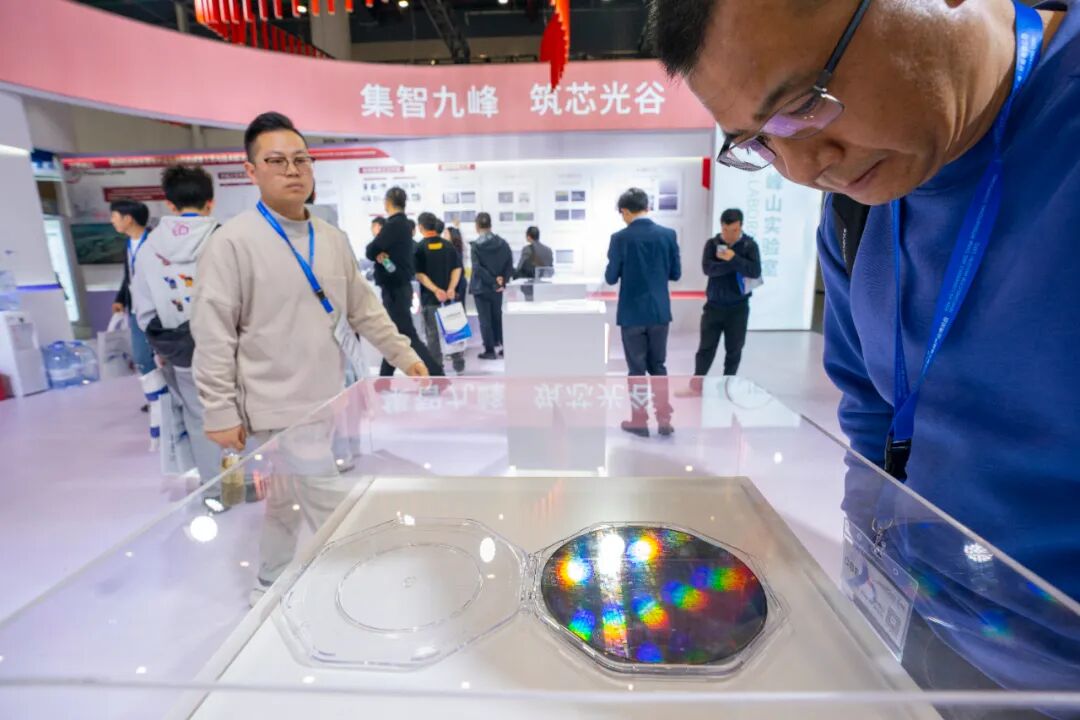 2024九峰山论坛暨化合物半导体产业博览会上,九峰山实验室新下线的8寸硅光薄膜铌酸锂光电集成晶圆吸引专业观众的目光。(湖北日报全媒记者魏铼 摄)