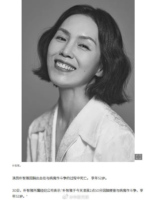 9月30日,韩媒传出消息,女星朴智雅离世。据韩媒报道,演员朴智雅因脑出血于今日凌晨去世,终年52岁。曾饰演《黑暗荣耀》女主文东恩母亲一角。据悉,朴智雅最近因脑梗塞晕倒后一直在医院治疗,最终未能醒来。