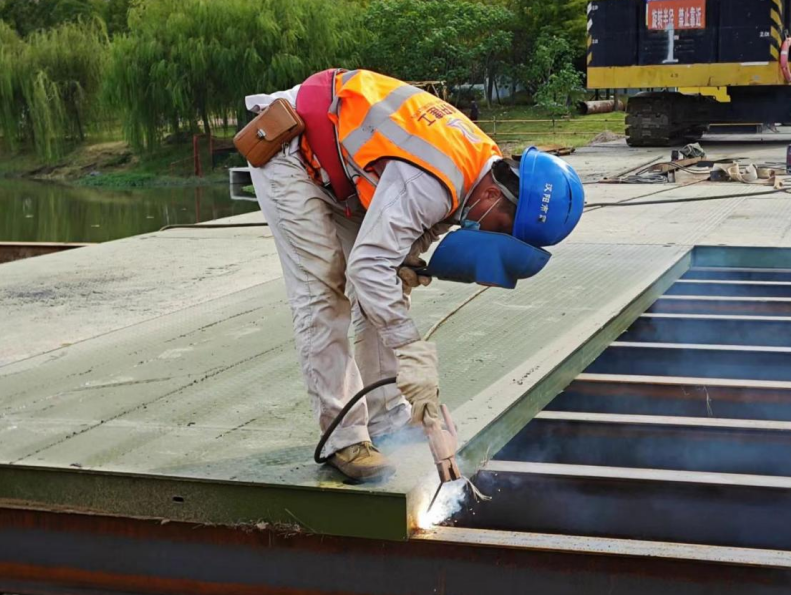 国庆期间,荆州经开区新华路跨西干渠桥及配套道路工程工地上,钢栈桥施工正酣。工人们身穿工装、头戴安全帽、手握焊枪,汗水沿着脸颊滑落,却无人停歇。加班加点,只为确保工程进度,他们的身影在钢架间穿梭,用实际行动诠释着建工人的责任与担当。
