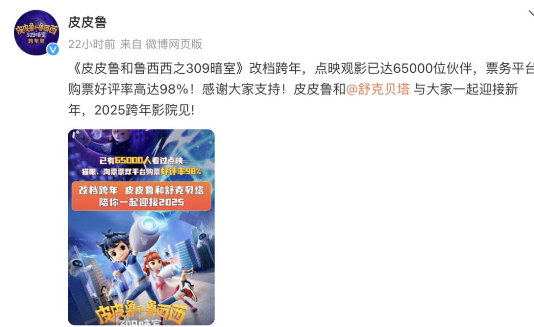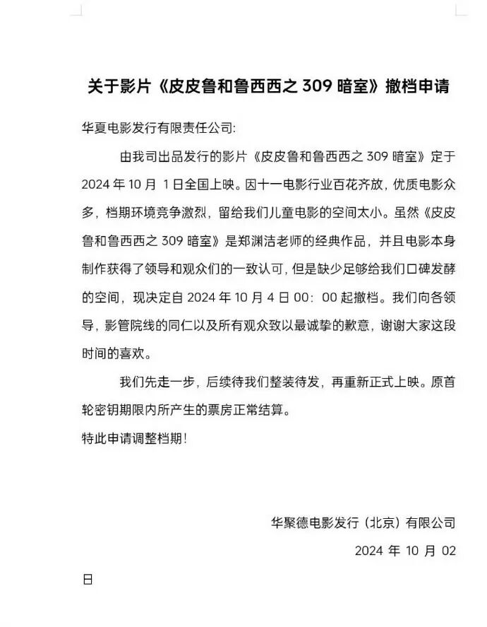 此外,动画电影《皮皮鲁和鲁西西之309暗室》宣布改档跨年。影片于10月1日上映,目前累计票房300.2万。