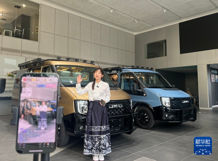 在随州一家房车企业,博主正在进行网络直播。新华社记者 喻珮 摄
