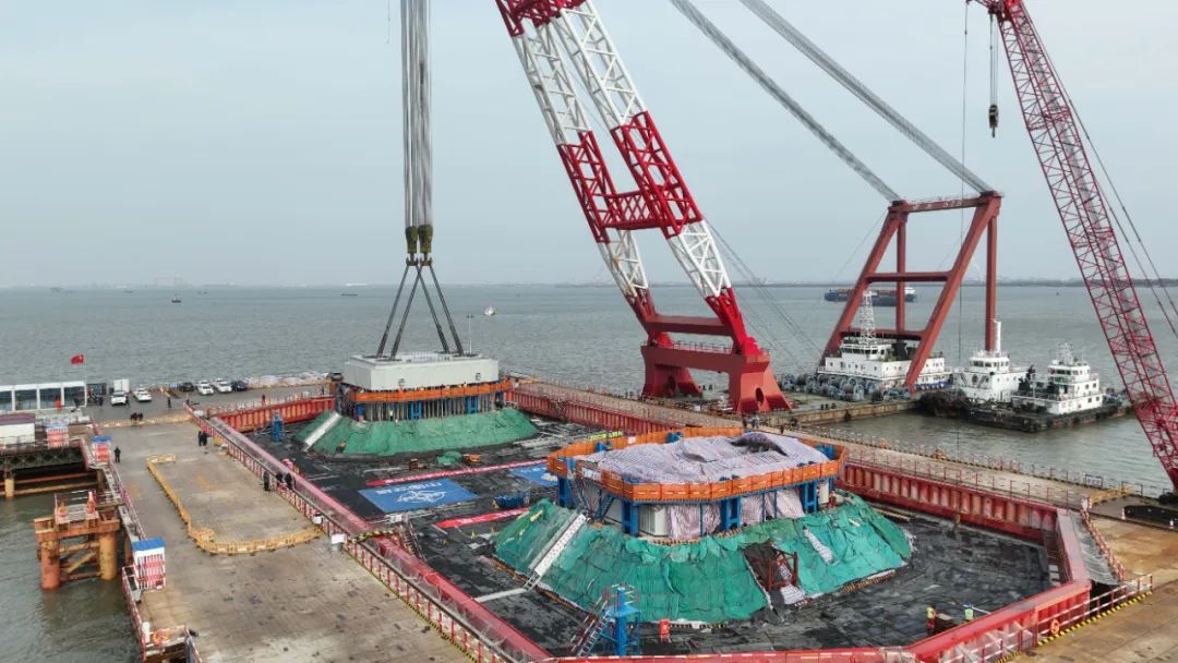 张靖皋长江大桥南主塔首节段安装施工现场。图/受访者提供