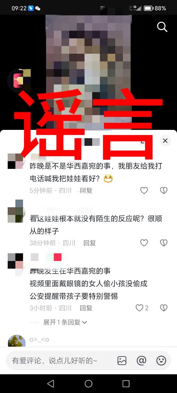 近日,资阳市高新区一网民在微信群发布“有人贩子抱小娃儿”的内容,引发大量网民关注,造成当地居民恐慌。经民警核实,该消息为不实信息。