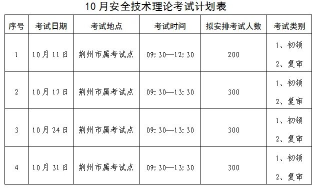 江汉风报道:为确保荆州市“三项岗位人员”考试有序开展,现将2024年10月考试安排公布如下。请各位考生根据个人实际完成培训的情况,及时联系所属的安全培训机构,确定是否参加本月的安全生产资格考试,并提前48小时预约考试。如有特殊情况,可在开考前半小时取消考试预约。考生未按时参加考试的,一律按缺考处理。考试不及格,允许补考一次。