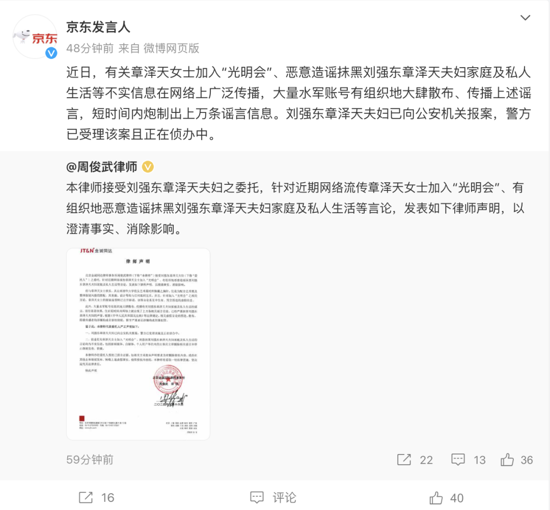 京东发言人微博10月16日发布消息,近日,有关章泽天女士加入“光明会”、恶意造谣抹黑刘强东章泽天夫妇家庭及私人生活等不实信息在网络上广泛传播,大量水军账号有组织地大肆散布、传播上述谣言,短时间内炮制出上万条谣言信息。刘强东章泽天夫妇已向公安机关报案,警方已受理该案且正在侦办中。
