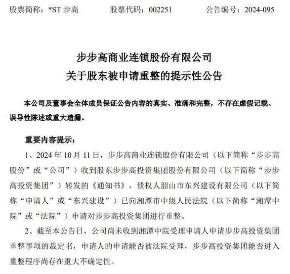10月11日晚间,*ST步高发布一则公告,公司股东步步高投资集团被申请重整。