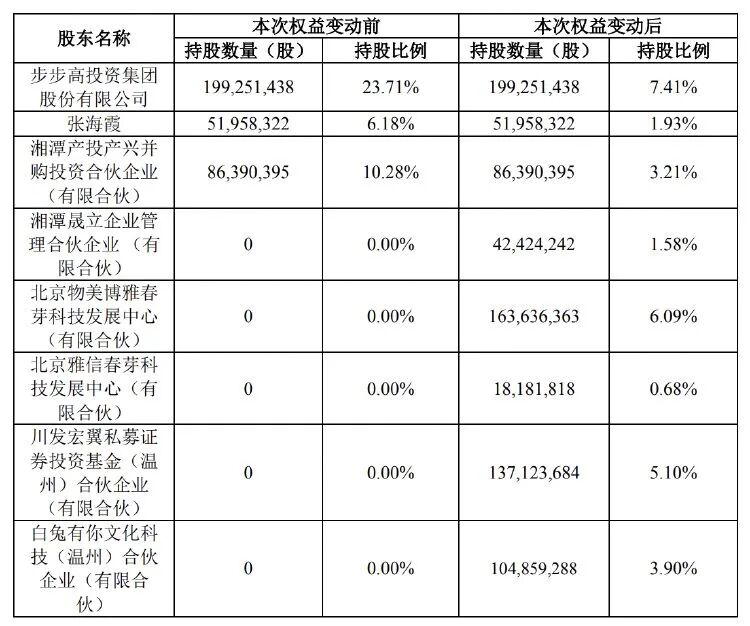 据步步高股份此前发布的公告,公司在重整之后引入了包括白兔集团、物美集团+博雅春芽等多个新股东,步步高创始人王填和湘潭国资的股份已被稀释。