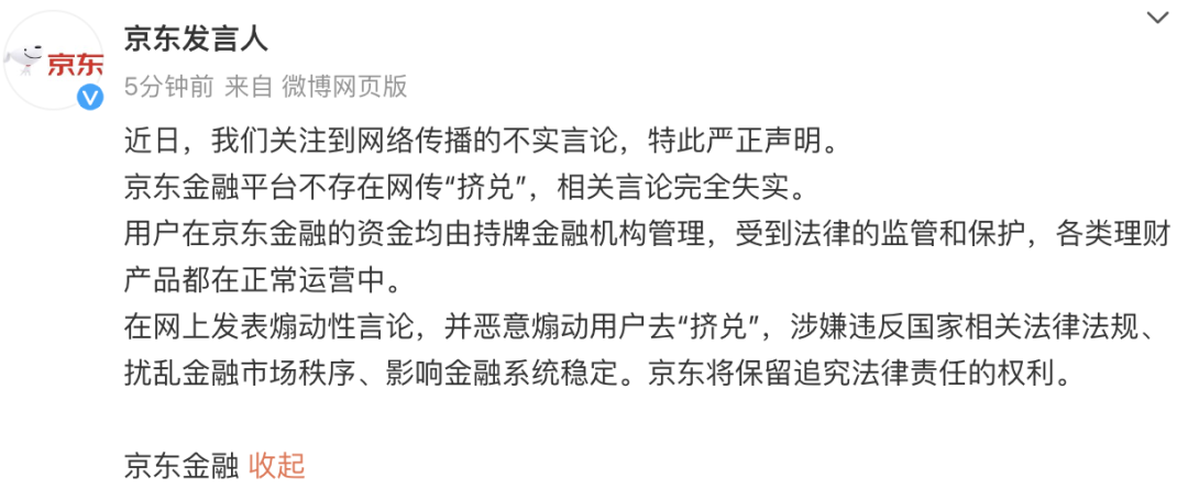 18日12时许,@京东发言人 发文回应此事称,京东金融平台不存在网传“挤兑”,相关言论完全失实。