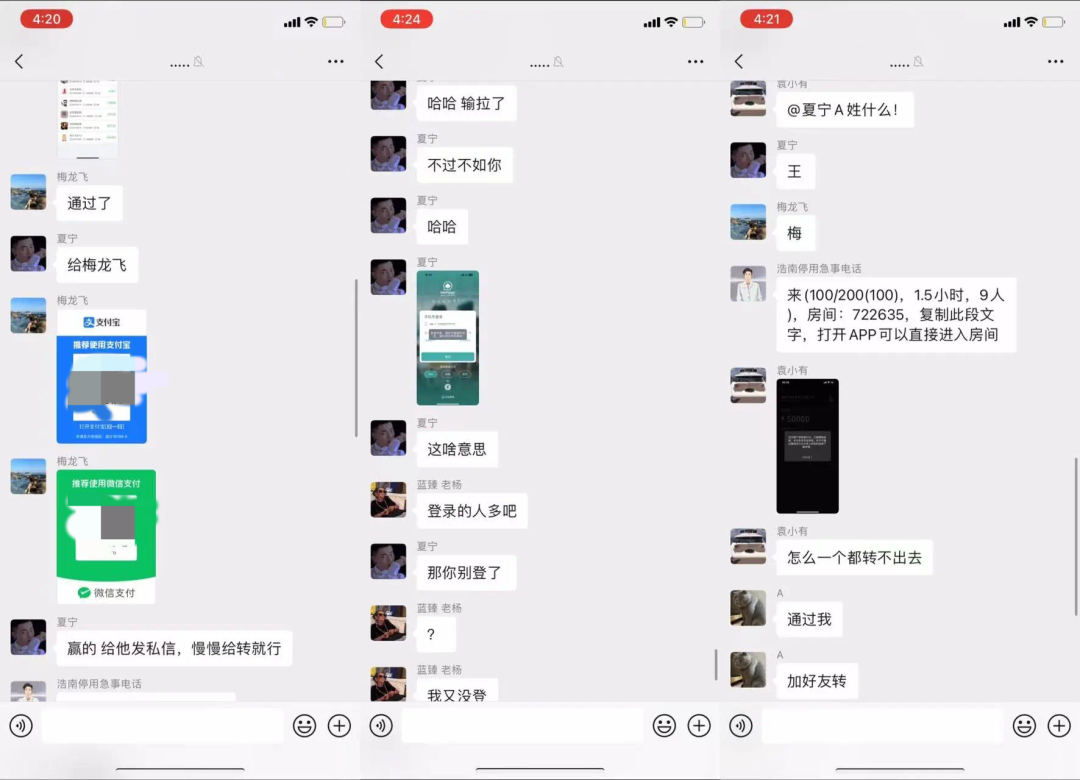 由于该app软件游戏平台不接受赌资,参与者就通过支付宝、微信等方式结算。从对方提供的聊天记录来看,这些主播不仅参与了赌博,而且涉及的金额巨大。根据微信支付宝交易转账截图来看,每次金额在1万到5万不等,一局流水就高达上百万。