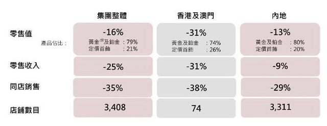 中国内地市场零售收入下跌9%,同店销售额下跌29%,港澳市场零售收入下跌31%,同店销售额下跌38%。