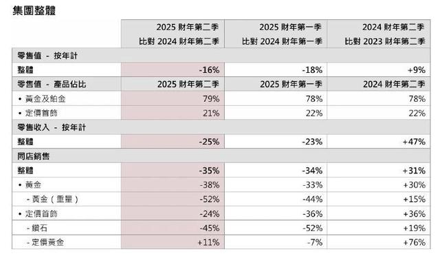 香港珠宝品牌六福集团10月17日晚间公布最新业绩数据,该集团2025财年第二季度(7月1日—9月30日)及10月首两周整体零售值下跌16%,零售收入下跌25%,同店销售下跌35%。黄金、钻石首饰同店销售分别同比下跌38%、45%。黄金及铂金产品在总零售值中占比79%,定价首饰占比21%。该集团表示,零售表现主要受高基数效应及金价屡创新高影响,在消费者适应高金价后,黄金销售有望恢复正常。