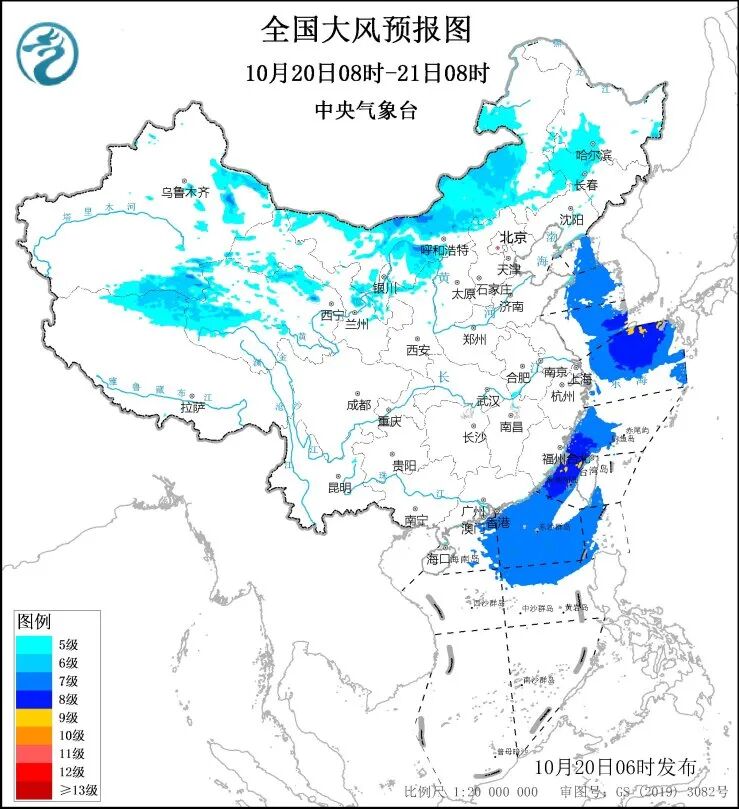 预计,10月20日08时至21日08时,内蒙古、黑龙江西南部、吉林中西部、新疆东部和南疆盆地、西藏北部、青海西部和北部、福建东南部沿海等地将有5至7级、阵风8至9级的大风;黄海大部海域、东海北部和西南部海域、台湾海峡、南海北部和中东部海域、巴士海峡将有7至8级、阵风9级的大风,其中东海东北部、台湾海峡的部分海域风力可达9级、阵风10级。