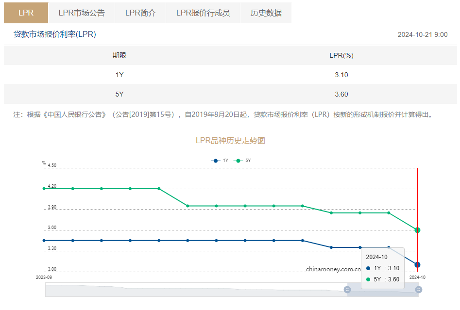 今天,中国人民银行授权全国银行间同业拆借中心公布,2024年10月21日贷款市场报价利率(LPR)为:1年期LPR为3.1%,5年期以上LPR为3.6%。以上LPR在下一次发布LPR之前有效。