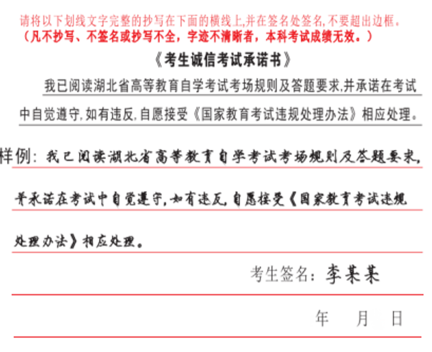 1.落实笔迹信息采集要求。考生应在答题卡指定区域完整抄写《考生诚信考试承诺书》(抄写样例如下图),凡不抄写、不签名或抄写不全,字迹不清晰者,该科考试成绩无效。考生毕业时,湖北省教育考试院将对每张答题卡上的《考生诚信考试承诺书》笔迹进行复核,凡笔迹不一致、经鉴定为代考的,将根据《国家教育考试违规处理办法》作出成绩作废、延迟毕业、记入国家教育考试诚信档案等处理。