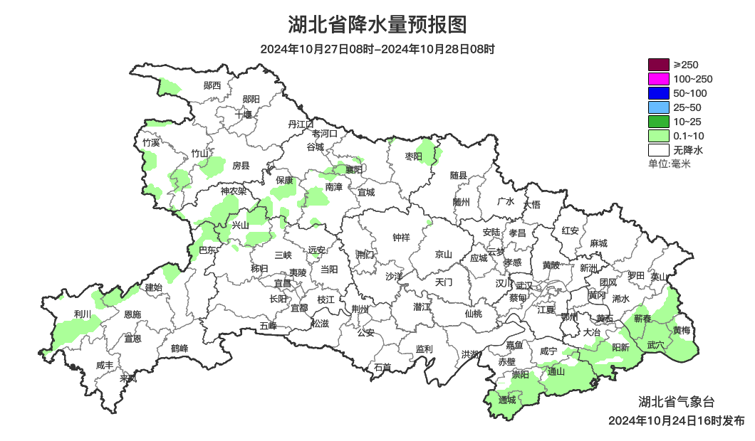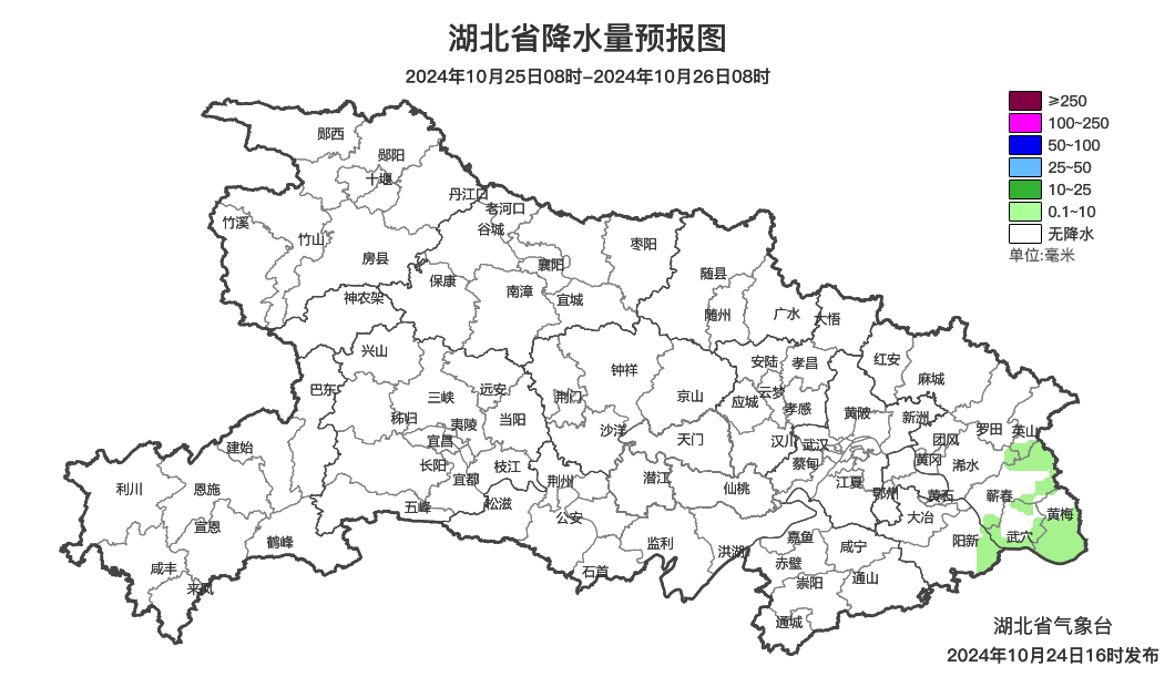 25日08时-26日08时,全省晴天到多云,其中鄂东南晚上局地有小雨。最高气温21~25℃,最低气温10~15℃,偏北风3到4级、阵风5到6级。