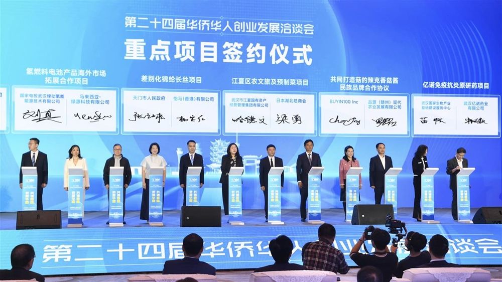 10月23日,第二十四届华侨华人创业发展洽谈会在武汉开幕。7个项目在开幕式现场签约,签约金额80亿元,包括现代农牧业全产业链建设项目、鄂州机场中加国际航运项目、氢燃料电池产品海外市场拓展合作项目等。