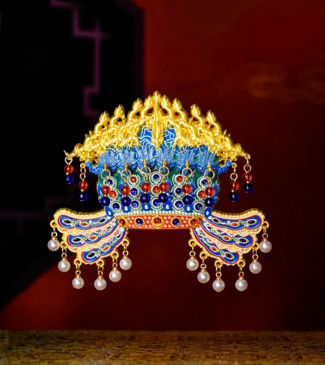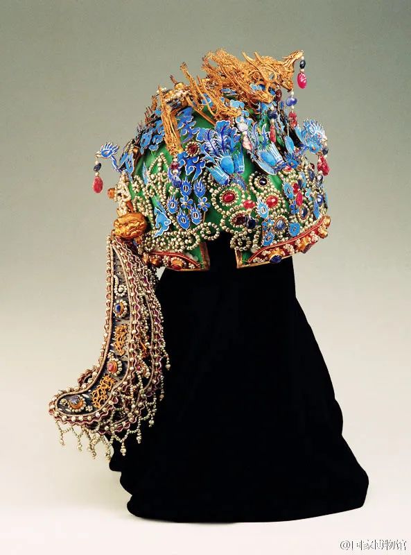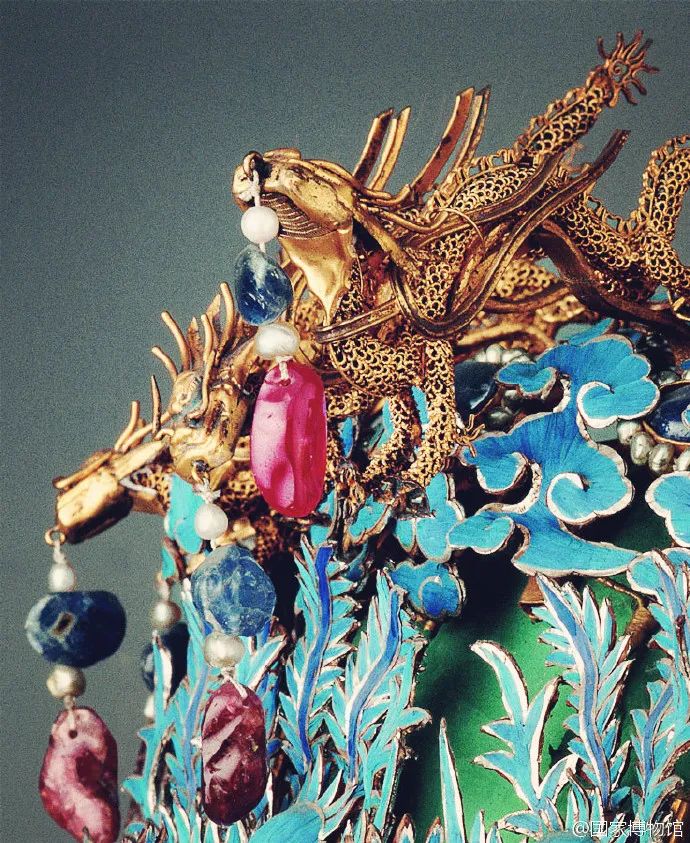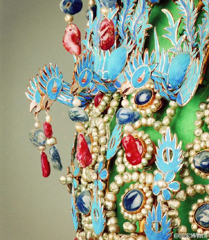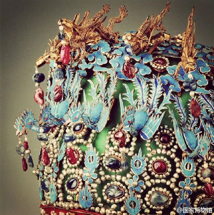 前部饰有九条金龙,口衔珠滴,下有八只点翠金凤,后部也有一金凤,共九龙九凤。冠檐底部有镶嵌宝石珠花的翠口圈,后侧下部左右各饰点翠地嵌金龙珠滴三博鬓,博鬓上嵌镂空金龙、珠花璎珞,似金龙奔腾在翠云之上,翠凤展翅翱翔于珠宝花丛之中。被国家文物局列入中国《首批禁止出国(境)展览文物目录》。