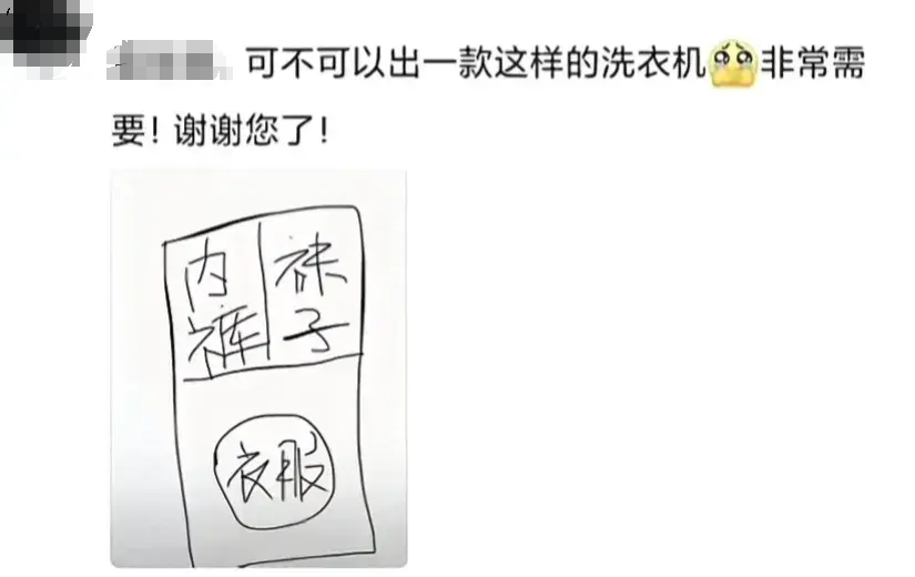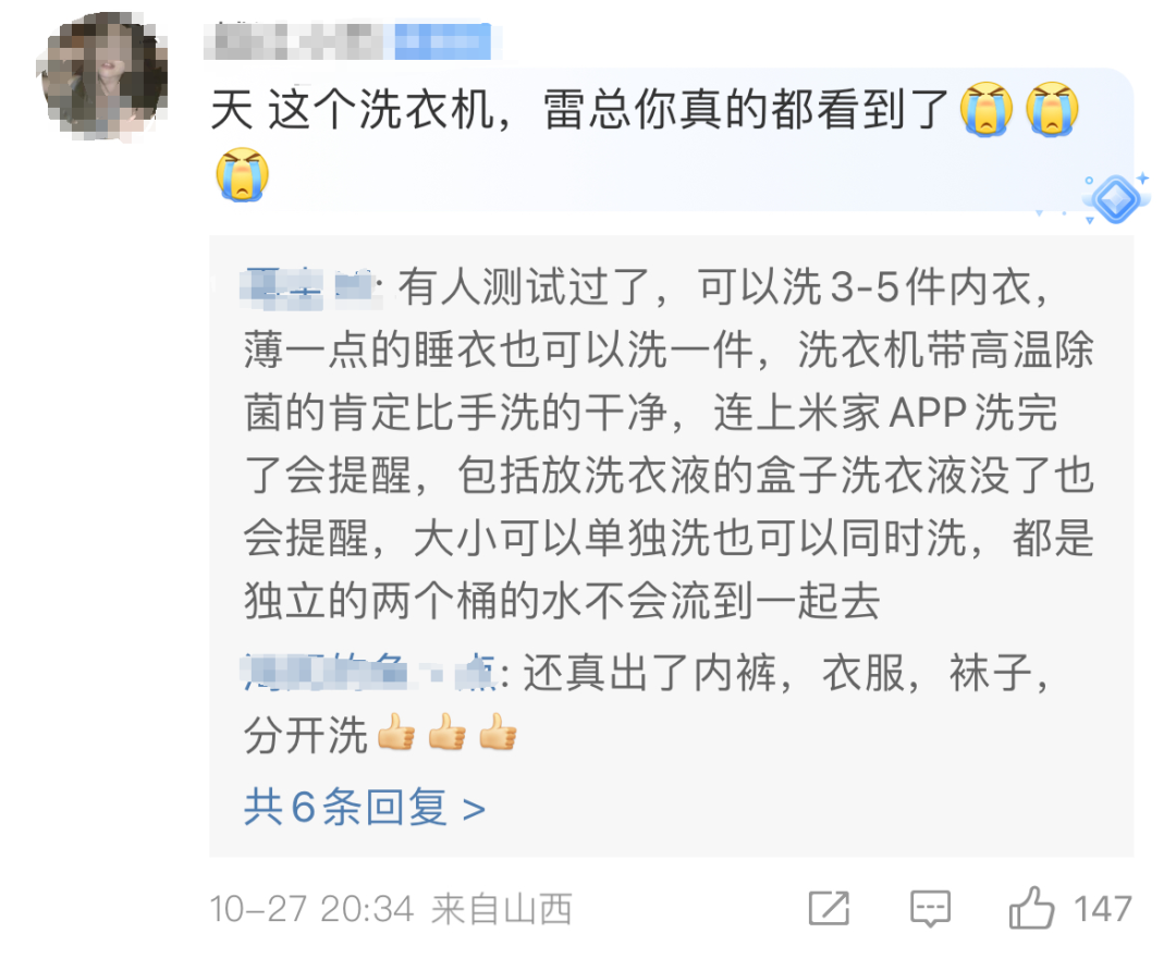 起因是有网友在雷军评论区留言:希望造出一款内裤、袜子和衣服分开洗的洗衣机。